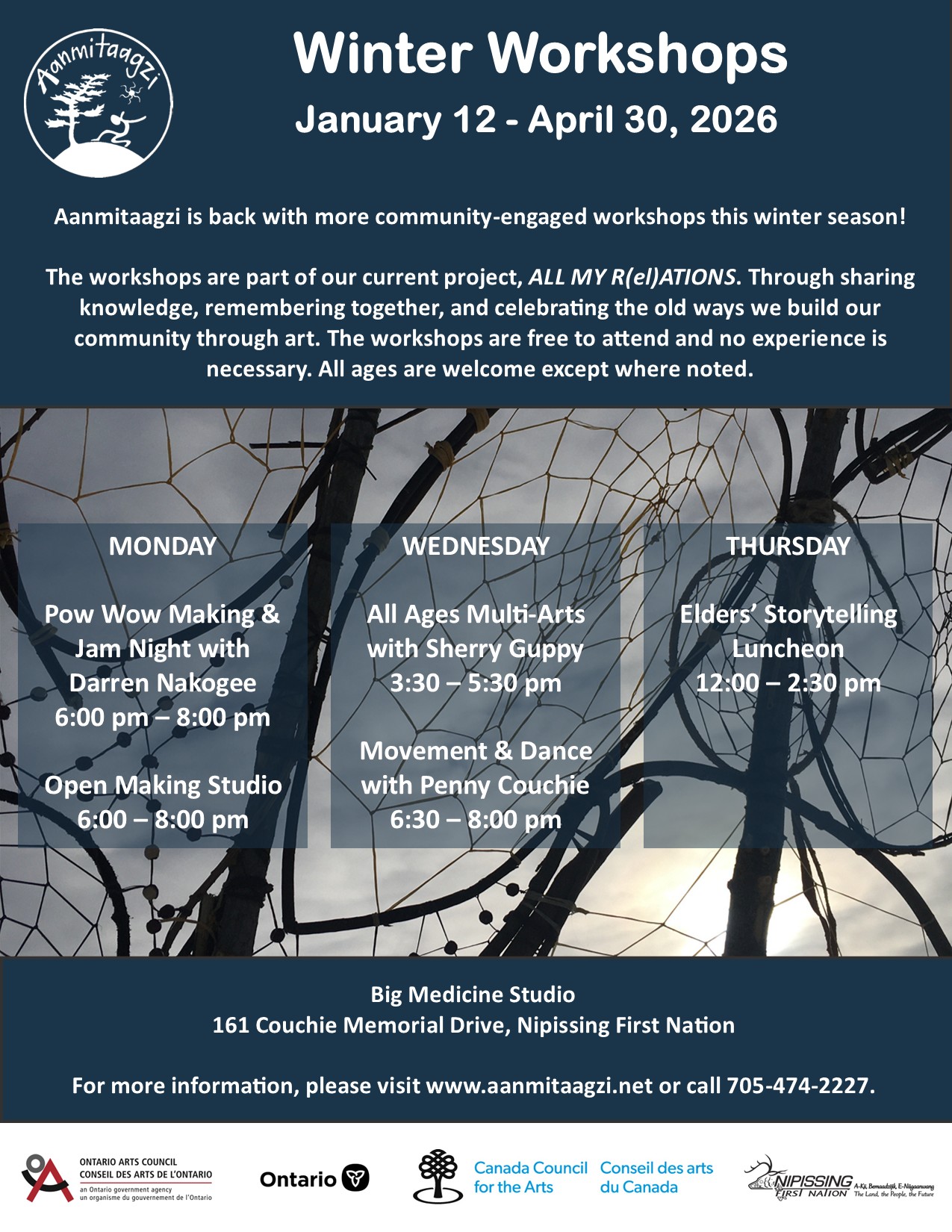 Aanmitaagzi is back with more community-engaged workshops for the 2026 winter season! The workshops are part of our current project, All My R(el)ations. Through sharing knowledge, remembering together, and celebrating the old ways we build our community through art.